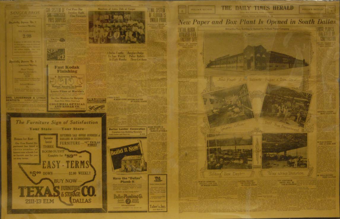 Upon his return from service, he took over the young business, which at the time only manufactured rigid boxes, and merged it with a paper jobbing business he had started called Pollock Paper Company. The combined entity became known as the Pollock Paper and Box Company. Seeing the potential for flexible packaging, he acquired the Dallas-based Wax Wrap Paper Company a year later, and in 1926 he subsequently consolidated all of his growing operations, including a new folding carton plant that would solidify his ability to provide a complete packaging service to all of his customers, into a new state of the art facility in Dallas, Texas.